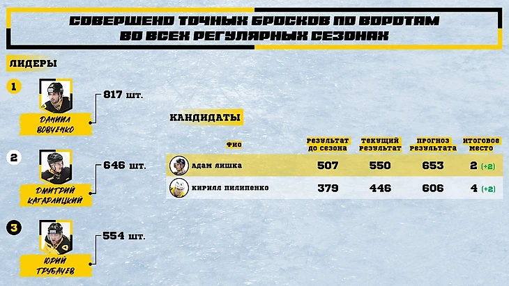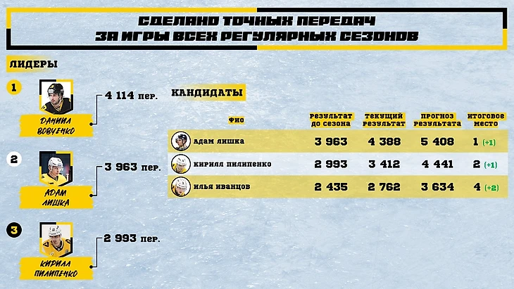 А вот по сумме передач за все матчи регулярок изменения происходят уже сейчас. Лишка уже обогнал Вовченко и стал единоличным лидером, теперь с каждым матчем он только увеличивает свой отрыв. Пилипенко пока еще не близко, но все же по итогам сезона также должен будет обогнать Даниила. Иванцов активен, но до третьего места (с учетом продвижения Пилипенко) не дотянется.