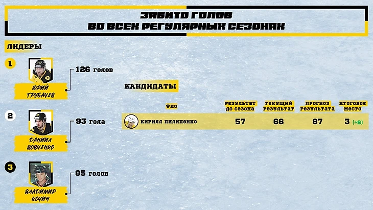 В сумме забитых голов за всю историю Пилипенко стартовал этот год с 9 позиции. За 20 игр он успел обогнать Кагарлицкого и сейчас находится в 1 голе от Сергея Бердникова и 4 от Вадима Шипачева. По прогнозам ему вполне реально попасть в тройку к концу сезона – так что тут у нас своя локальная «погоня за Гретцки».