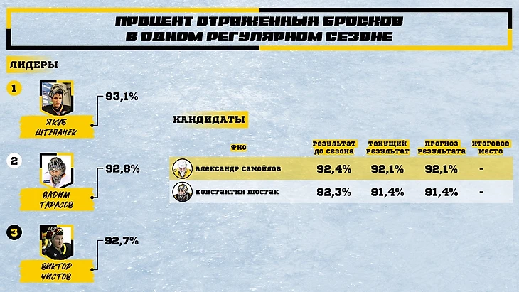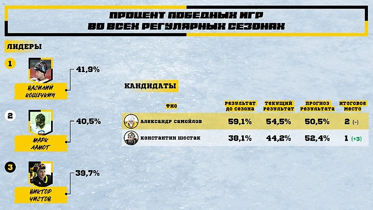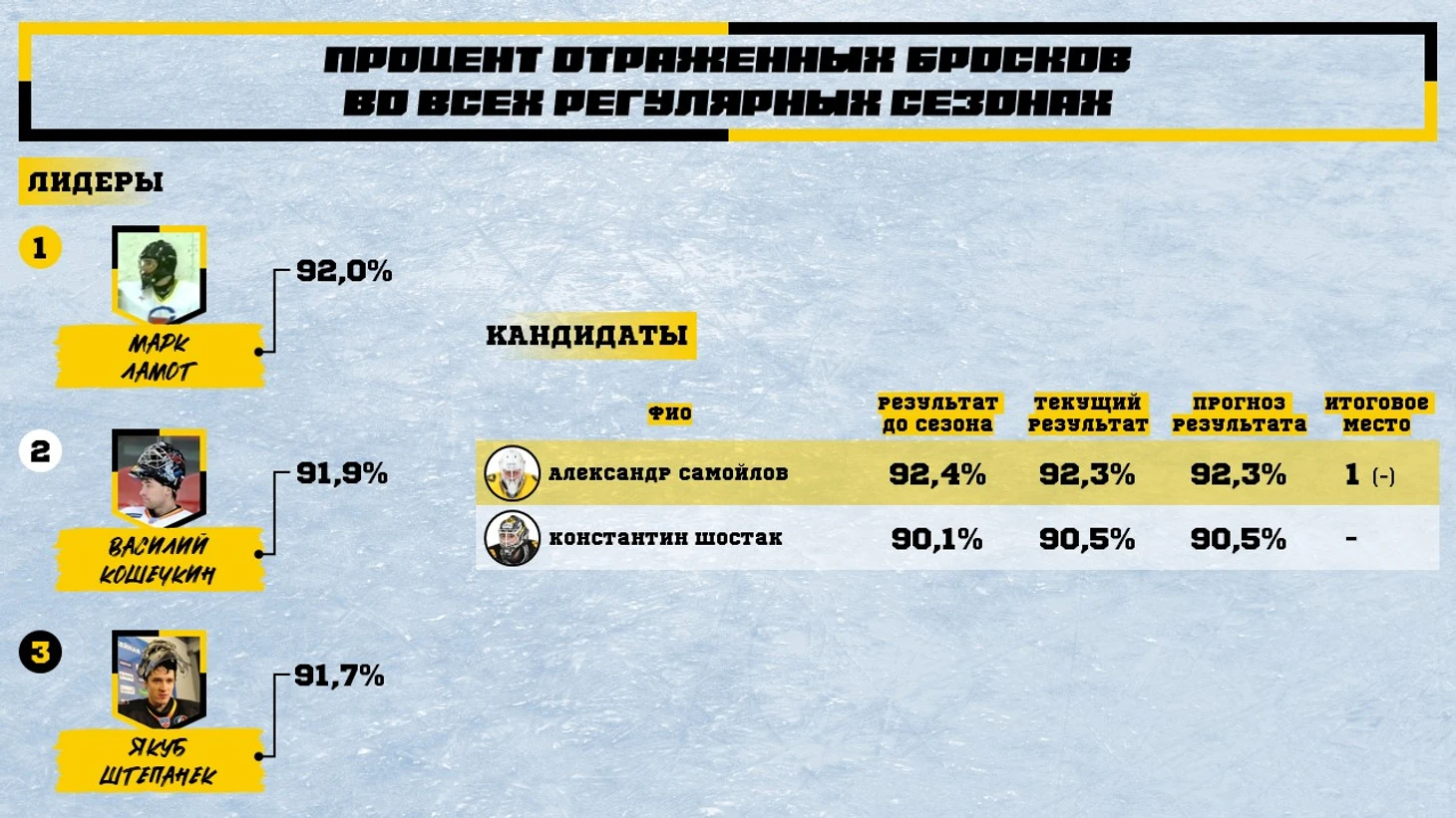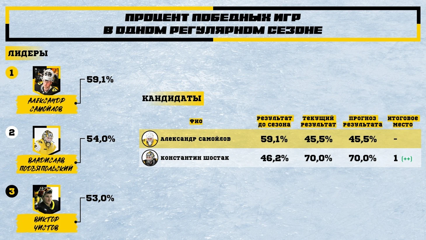 По суммарному проценту побед за все сезоны оба вратаря могут занять 1 место и между ними будет идти серьезная борьба. Самойлову все-таки проще, так у него предыдущие результаты были лучше, чем у Шостака.