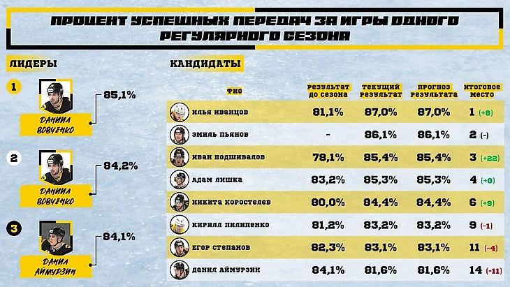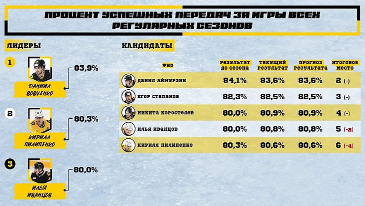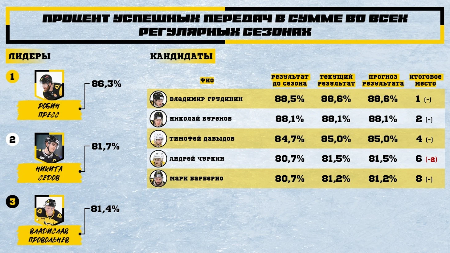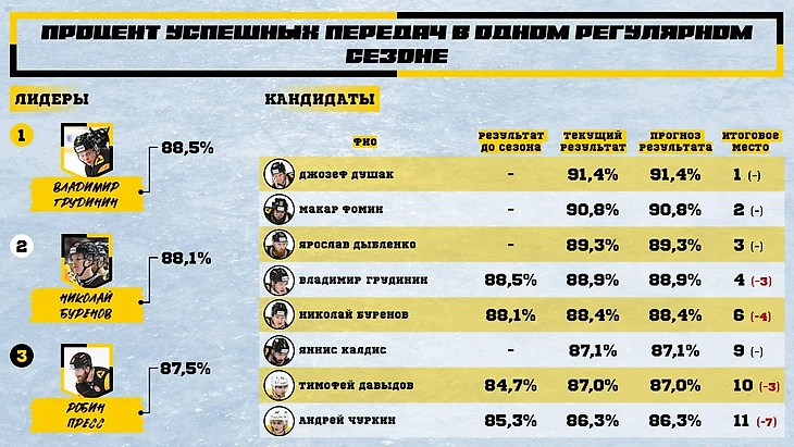 По сумме нескольких сезонов также должны будут обновиться лидеры: Грудинин, Буренов и Давыдов показывают стабильный результат по точности передач второй сезон подряд и вполне могут полностью занять весь пьедестал.