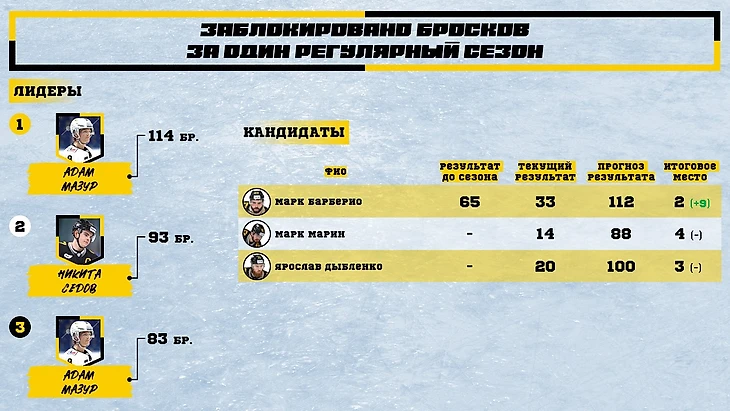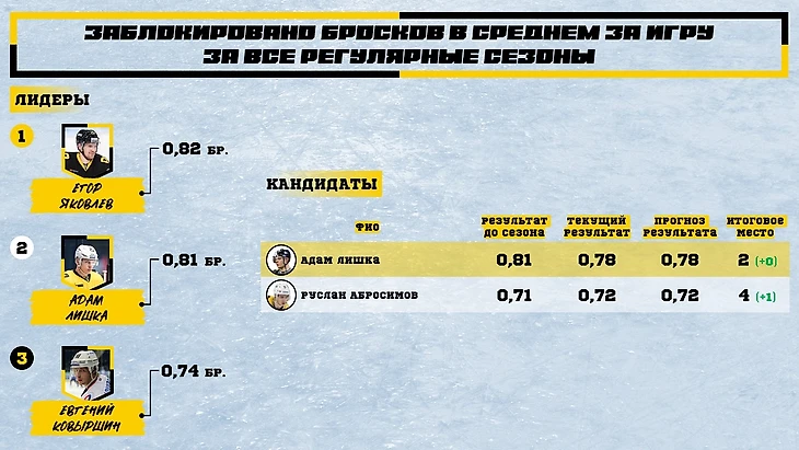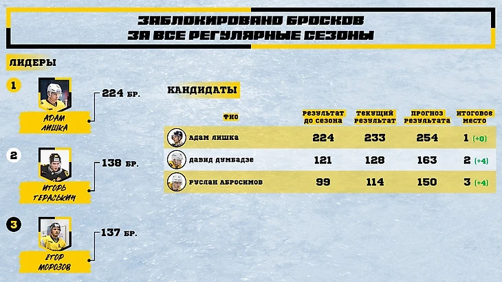 В пересчете на игру показатель по количеству блоков у Лишки ухудшается, но прочно держится на втором месте. У Абросимова есть шансы обогнать Ковыршина, но пока он не дотягивает по активности.