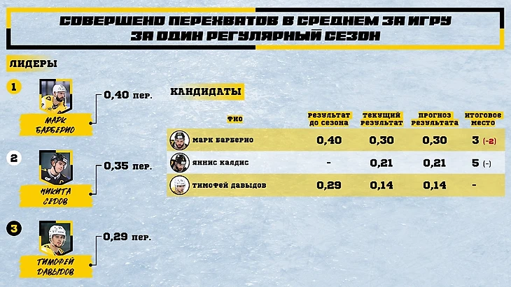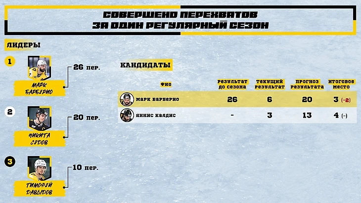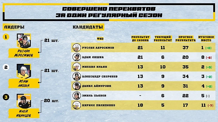 На очереди дополнительные показатели. Перехваты считаются всего лишь второй сезон, поэтому тут возможно много изменений: многие игроки претендуют не только на тройку, но и на первое место. Лучше всех пока что идет Абросимов.