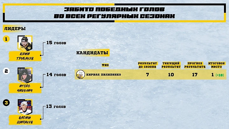 По сумме всех победных голов Кирилл пытается догнать Шипачева, и с текущим темпом можно даже стать первым (но его очень сложно удержать до конца сезона). Пока же он поднялся с 19 места на 11е – до Вовченко, Страки и Монса (5-7 места) всего 1 гол.