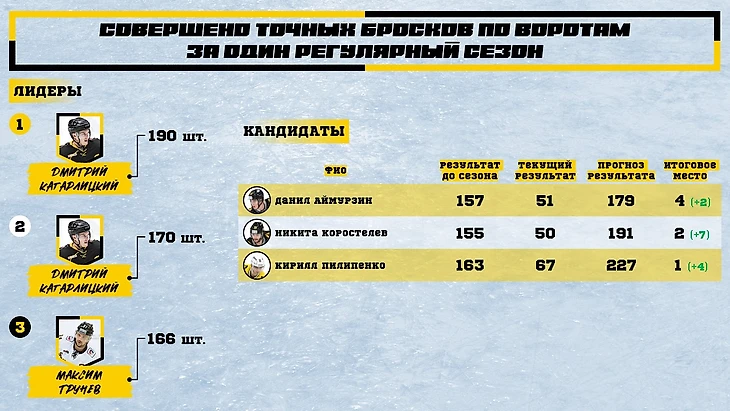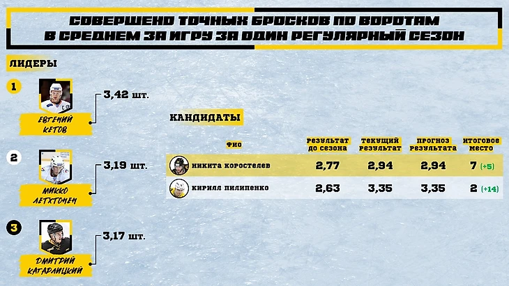 Нападающие явно стали больше бросать в этом сезоне – это отражается и на прогнозе результатов: Пилипенко с такой активностью с большим запасом обгонит Кагарлицкого. Коростелев и Аймурзин немного отстают, но в тройку вполне могут попасть.