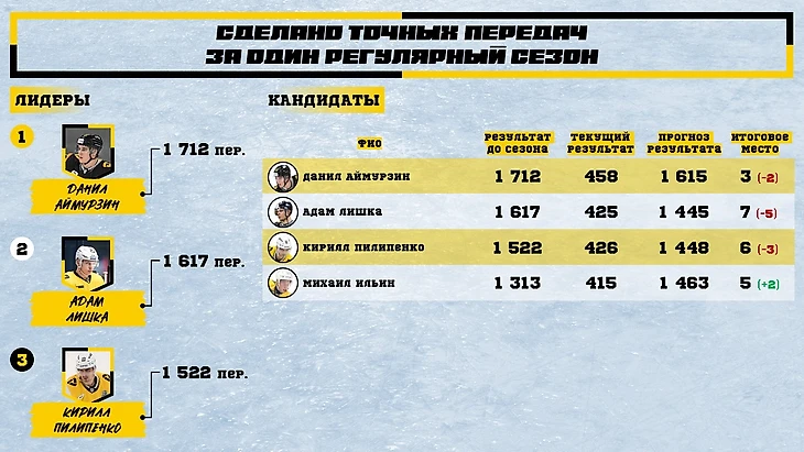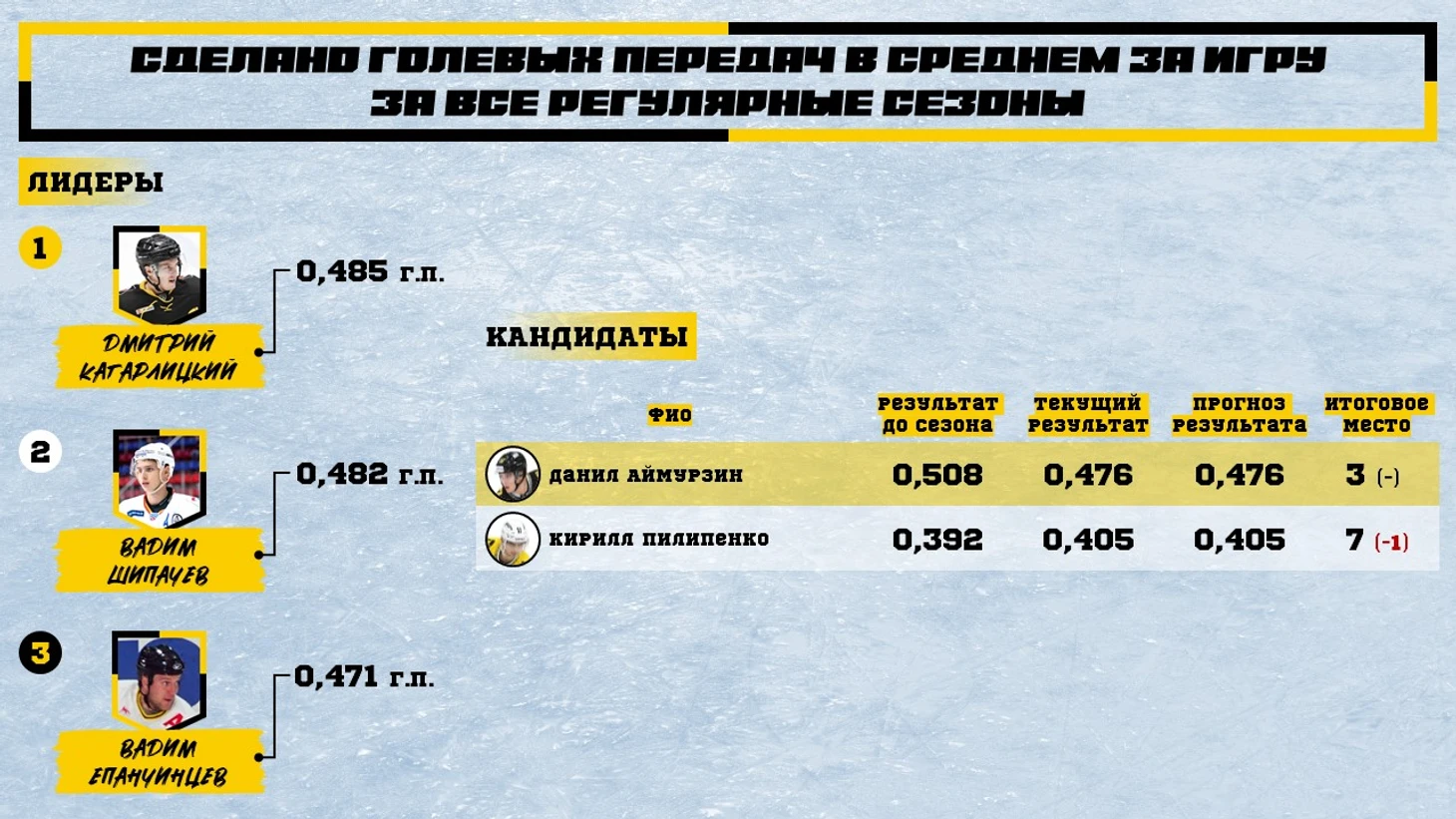 Лучшим ассистентом в этом году является Кирилл Пилипенко (Аймурзин переквалифицировался в снайпера) и по прогнозам может вытеснить из тройки как раз-таки своего партнера по звену. Другой напарник (Михаил Ильин) также дышит в спину.