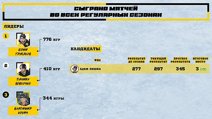 Среди главных ветеранов команды изменений нет. Здесь только Адам Лишка может войти в историю и обогнать Владимира Кочина, но для этого нужно не пропускать матчи весь сезон. Лишка начал с 11 места и за 20 игр обогнал Игоря Никулина и Сергея Бердникова. Следующий – Игорь Петров (до него 6 игр). Если смотреть только на игры КХЛ, то тут Адам остается на 6 месте.