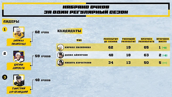 В показателе по набранным за сезон очкам Дмитрию Кагарлицкому будет очень сложно удержаться на третьем месте: и Аймурзин и Пилипенко и Коростелев идут с более высоким темпом.