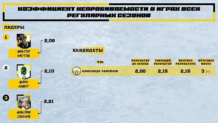 По суммарному коэффициенту непробиваемости во всех сезонах Самойлов вполне может войти в тройку. У Шостака шансы минимальны, так как и ранее и сейчас коэффициент далек от идеала.