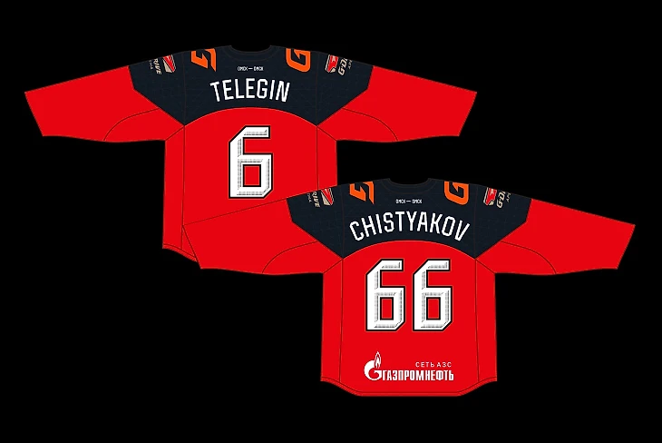 Затем в Омске обратились к, не побоюсь сказать, великой студии Артемия Лебедева, которая до этого в плане хоккейных форм отмечалась не самыми удачными кейсами. По задумке дизайнеров студии выделение плеч должно символизировать своды «G-Drive Арены». Ну... На мой взгляд вышло так себе, не докрученно. Более классический вариант от «Q10» был гораздо удачнее. От золотого отказались, причем зря. В результате спонсор размещается как в старые-добрые: на огромной белой плашке. Шрифт номеров слегка потерял в солидности, а неосмысленное размещение цифр прямо на границе графики на рукавах ставит под сомнение компетентность исполнителей.