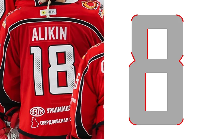 Десятилетие назад файл с этим начертанием валялся на ныне почившем сайте hockeyjerseyconcepts как чья-то самодельная версия шрифта «Buffalo Sabres» – 2006, хотя напоминал его лишь отдаленно. С сезона 2018/19 данная кустарщина неожиданно получила жизнь на форме далеко не последнего клуба второй лиги мира. Неужели такая кривая восьмерка никого не триггерит? Очередной случай некомпетентности и наплевательского отношения к деталям.