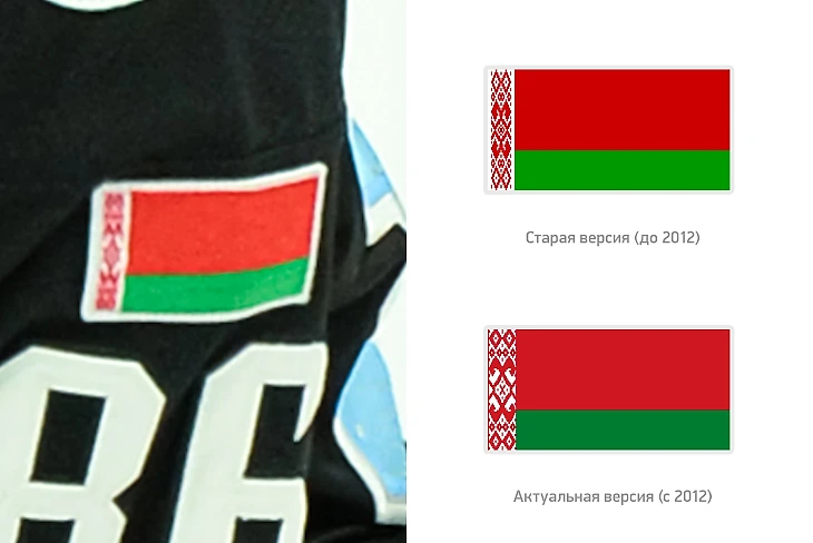 Кстати, весьма иронично, что на форме белорусской команды размещена устаревшая версия флага с белой прожилкой между орнаментом и красным полотнищем, а также с более яркими оттенками красного и зеленого, хотя прошедшим летом именно с подачи минчан лига проводила ревизию среди команд-участников на предмет корректности флага Беларуси, вывешиваемого под сводами арен.