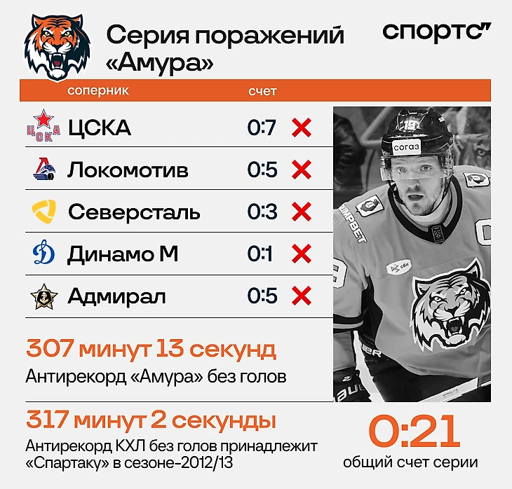● Заменили вратаря, но напрасно. Во всех пяти поражениях «Амура» в воротах со старта выходил Игорь Бобков. В большинстве случаев в него верили до конца, даже несмотря на не самую лучшую статистику – 85,8% сэйвов в последних пяти матчах.