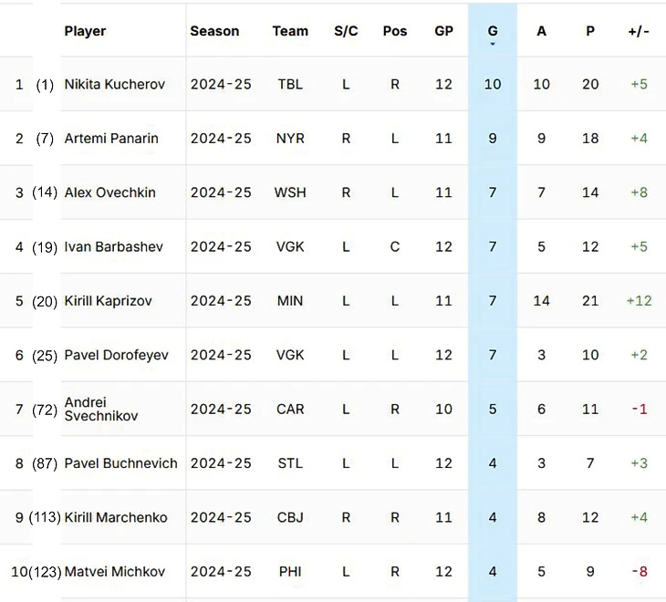 В топ-50 всей лиги на данный момент располагается 7 российских нападающих.