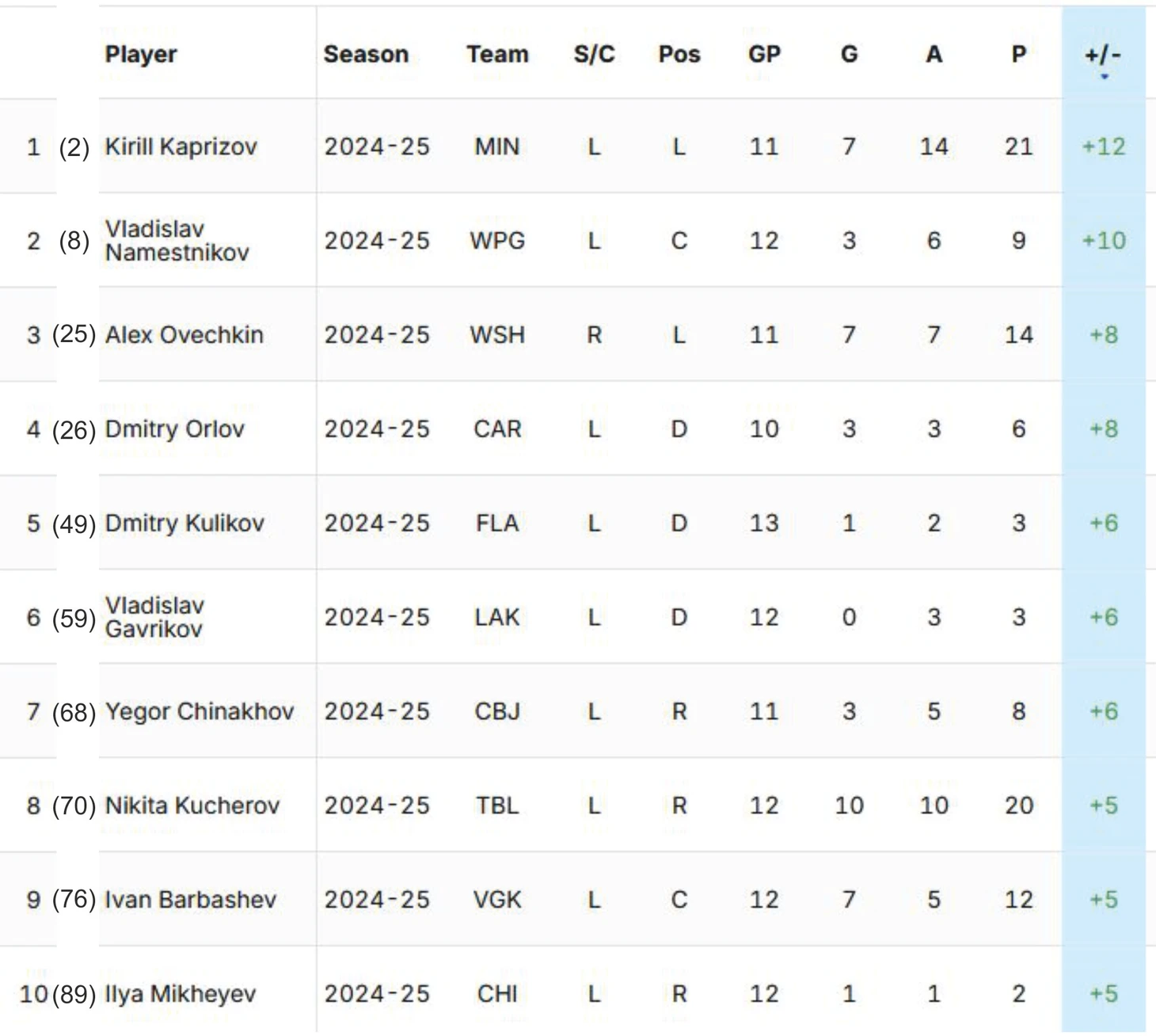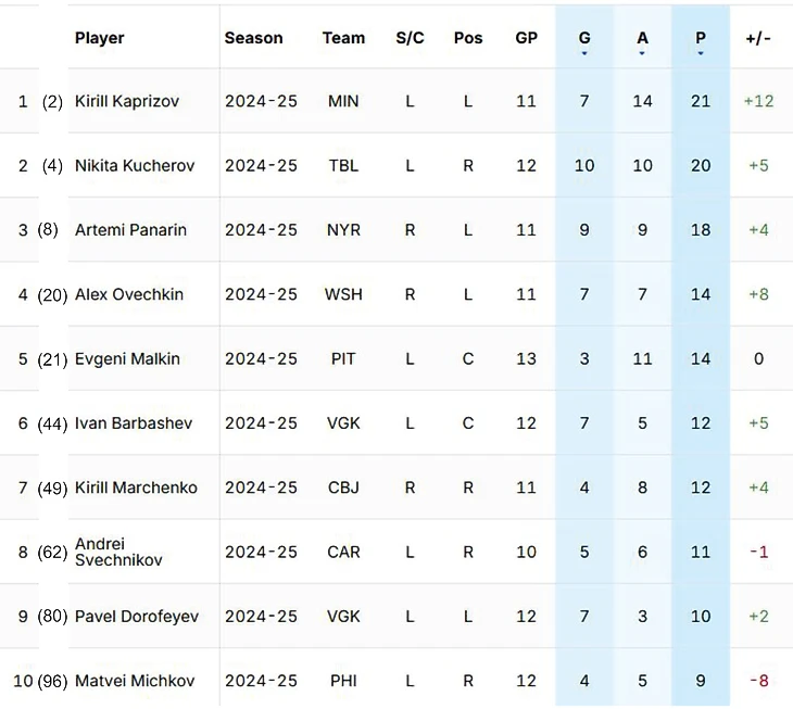 В списке бомбардиров Кирилл Капризов вышел на первое место среди российских игроков, у него после 11 матчей 21 (7+14) очко в активе. Тройка лидеров не поменялась, изменилось расположение: Капризов (21 очко), Кучеров (20 очков) и Панарин (18 очков).