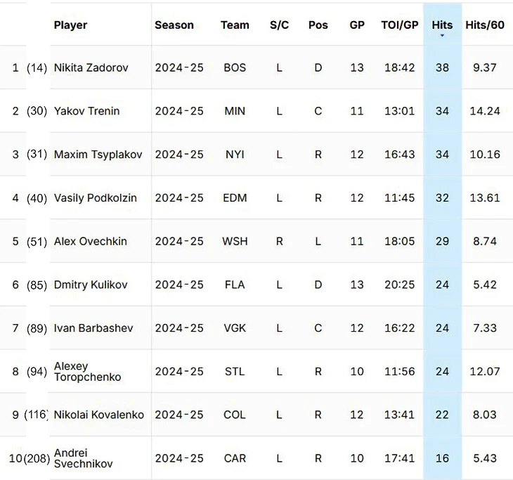 По показателю силовые приёмы на 60 минут топ-5 лидеров выглядит по-другому: 1) Яков Тренин с 14.24 (34 хита, 11 матчей); 2) Василий Подколзин 13.61 (32 хита, 12 матчей); 3) Никита Прищепов 13.33 (3 хита, 1 матч); 4) Клим Костин 12.39 (12 хитов, 7 матчей); 5) Алексей Торопченко 12.07 (24 хита, 10 матчей).