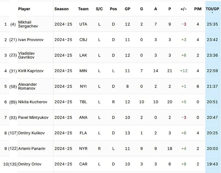 В топ-10 входят всего 3 форварда: Кирилл Капризов с 22:59 средним временем, Никита Кучеров с 20:51 и Артемий Панарин с 20:03.