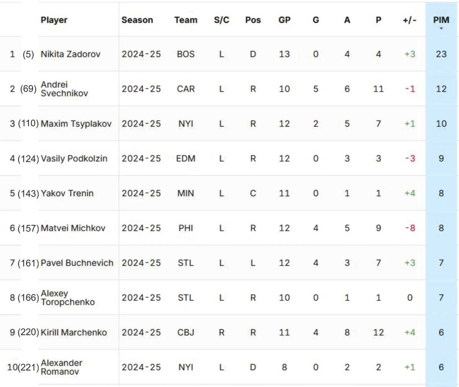 Никита Задоров продолжает лидировать по количеству штрафных минут. На второе место вышел Андрей Свечников, который на прошедшей неделе дважды получал 2-минутные удаления. На третью строчку поднялся Максим Цыплаков, который также дважды удалялся на неделе. Василий Подколзин добавил 5 минут в свою статистику штрафов, подравшись в игре против «Нэшвилла».