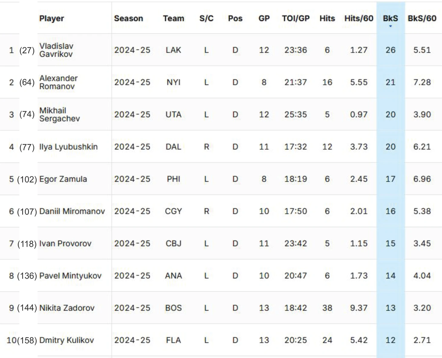 По заблокированным броскам на 60 минут игрового времени тройка лидеров выглядит следующим образом: 1) Александр Алексеев с показателем 12.73 («Вашингтон», 3 матча, 9 блоков); 2) Александр Романов 7.28 («Нью-Йорк Айлендерс», 8 матчей, 21 блок); 3) Егор Замула 6.96 («Филадельфия», 8 матчей, 17 блоков).