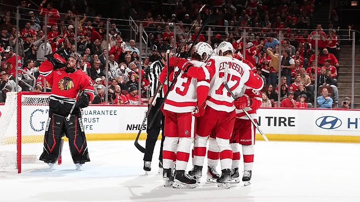 «Чикаго Блэк Хоукс»-»Детройт Ред Уингз» 1:4. Дилан Ларкин и Алекс ДеБринкат набрали по 2 очка (1+1), Кэм Тальбо отразил 28 бросков.