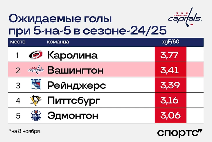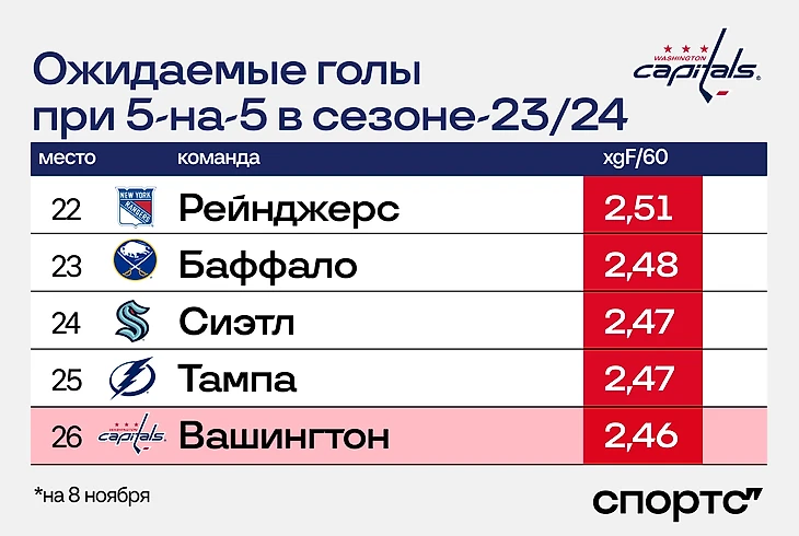 И особенно в случае с «Вашингтоном», который, выбравшись в плей-офф по итогам регулярки-23/24, был 26-й командой лиги по контролю шайбы (примерно так стоит расшифровывать ожидаемые голы) в равных составах.