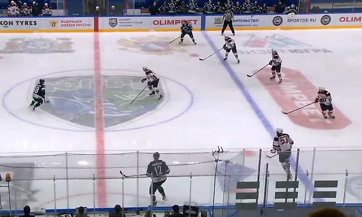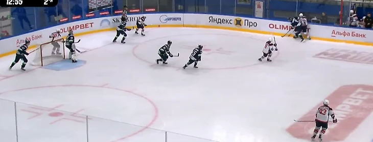 В случае когда в зоне обороны шайба у защитника соперника на синей линии, саратовцы поднимаются высоко и при переходе шайбы в среднюю зону быстро выходят из своей.