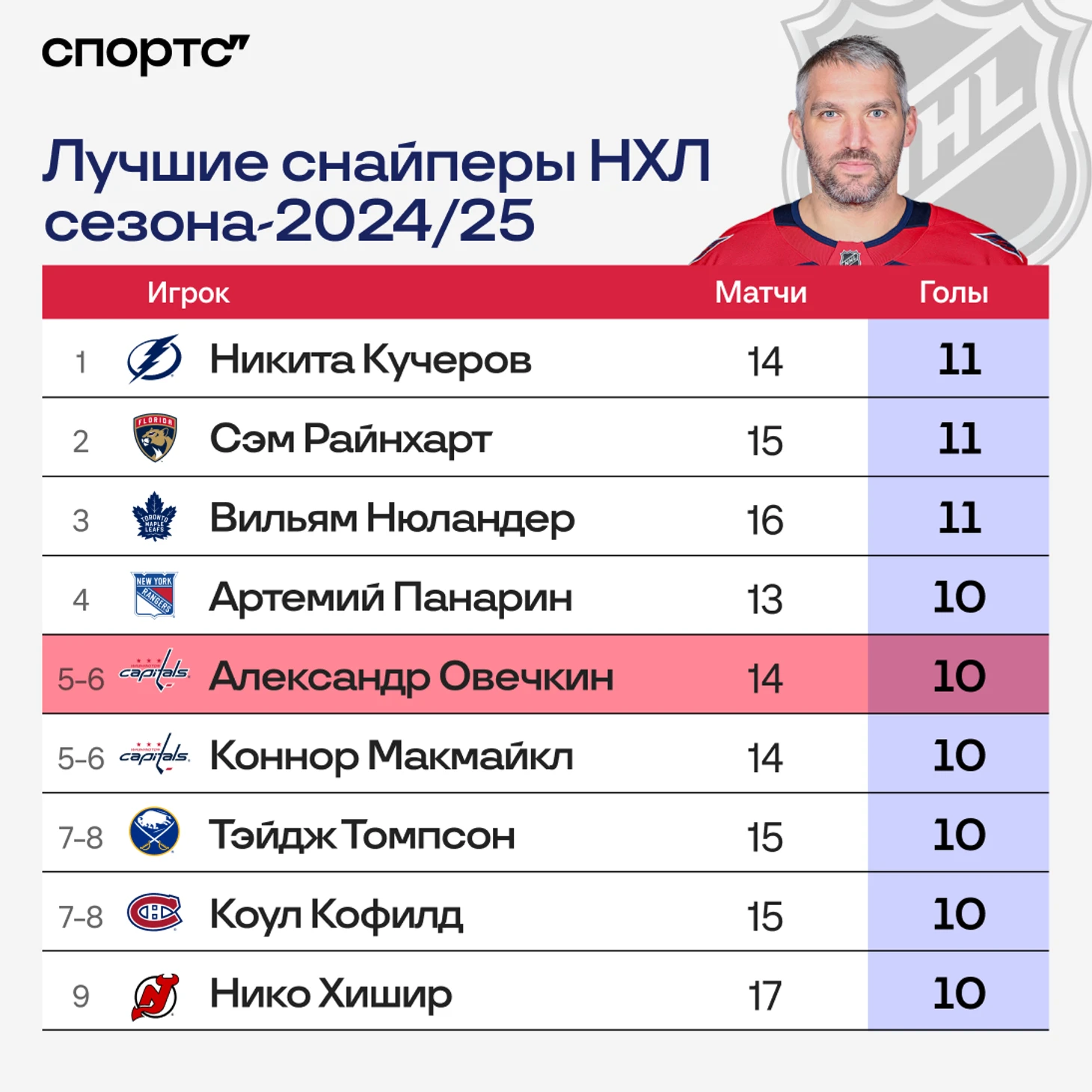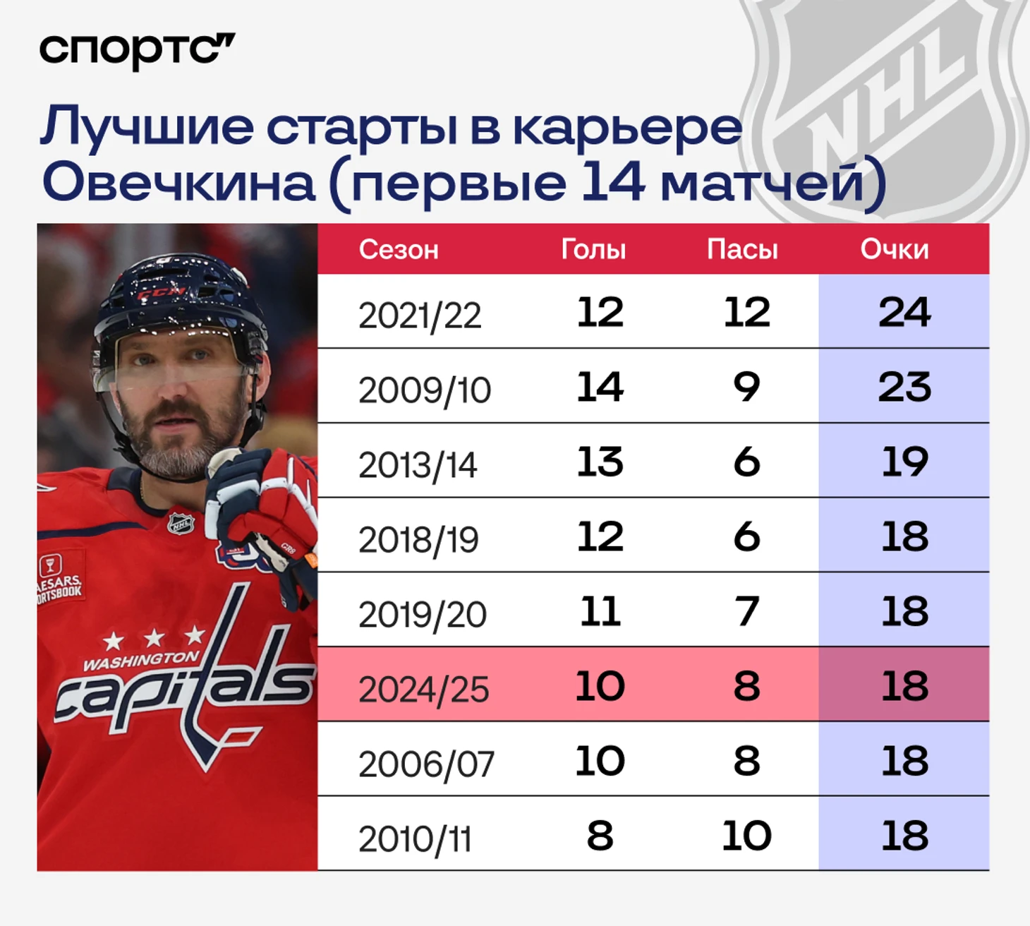 У Александра теперь 10 голов в сезоне – и он незаметно забрался в топ снайперов НХЛ. До первого места – 1 шайба. И это в 39 лет!