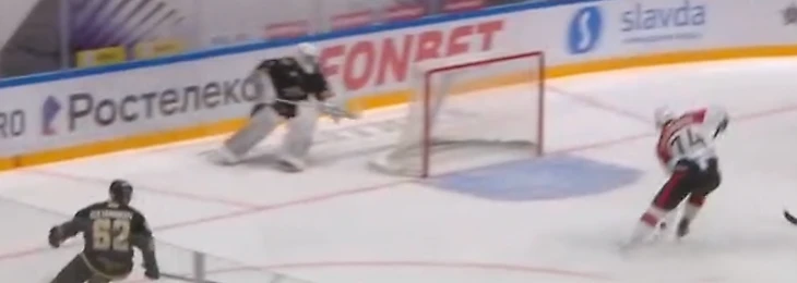 Забавно, что за день до этого Прохоркин стал героем другого курьеза – неказистым броском из-за ворот забил первый гол после возвращения в КХЛ. Да-да, точно из той позиции, в которой он изображен на стоп-кадре.