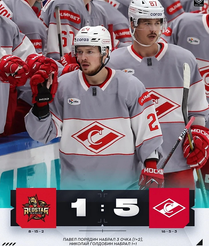 ХК «Спартак» одержал уверенную победу в выездном поединке против китайской команды «Куньлунь» со счётом - 5:1.