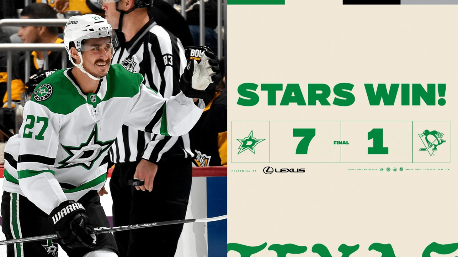 «Питтсбург Пингвинз»-»Даллас Старз» 1:7. Гости в первом периоде забросили 6 шайб. Мэйсон Марчмент набрал 5 очков (1+4), Мэтт Дюшен набрал 3 очка (1+2), Миро Хейсканен забросил 2 шайбы, Брендан Смит и Эса Линделл отдали по 2 результативные передачи, Джек Оттинджер отразил 20 бросков.
