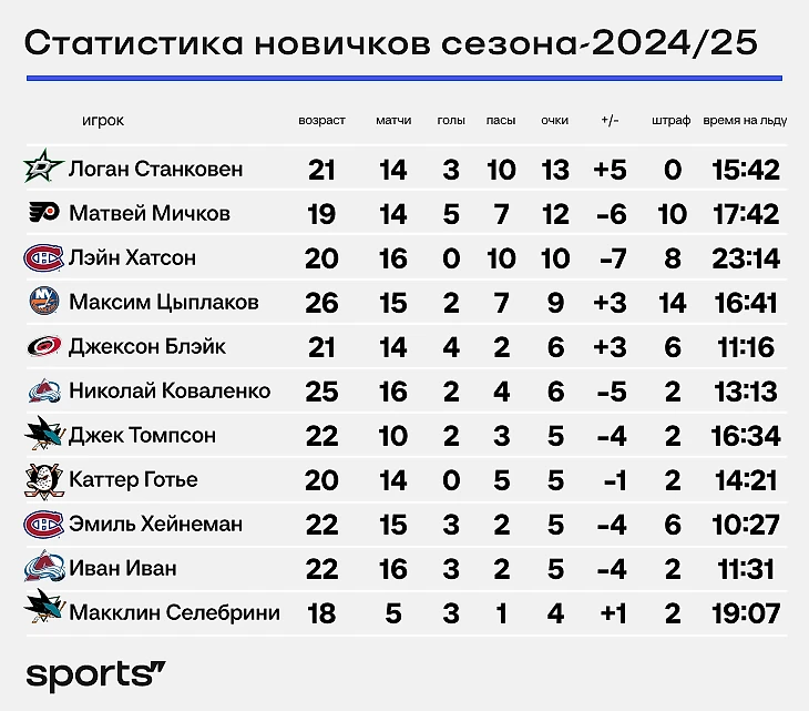 Бросается в глаза довольно низкое место первого номера драфта-2024 Макклина Селебрини, который не входит даже в десятку, но нападающему подпортила все травма, выбившая почти на месяц. Если доиграет сезон без повреждений – вполне может влететь в тройку, а то и стать первым.