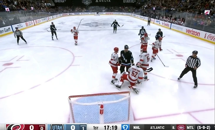Юта на второй минуте матча уже смогла организовать небольшое волнение у ворот Кочеткова. Но уже в середине первого периода счет по броскам в створ ворот был в пользу гостей встречи (десятая минута матча 5:2 по броскам). На седьмой минуте первого периода Джек Макбейн №22 (16 игр, 4+3) зарабатывает на себе удаление и Себастьян Ахо №20 (15 игр, 3+1) отправляется на две минуты за задержку клюшкой. Лишь под конец большинства Майкл Кессерлинг №7 (16 игр, 3+6) смог пройти по центру в зоне гостей и совершить опасный момент, но на деле момент оказался лишь опасным....