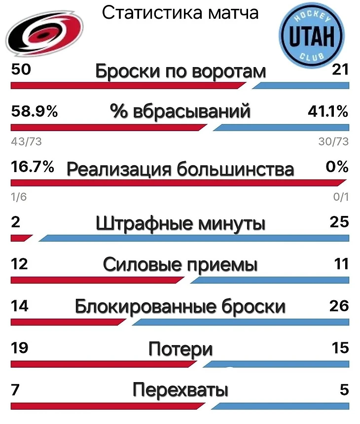 Спустя 5 минут игры в большинстве гл.тренер Каролины Род Бриндамор обладатель золотой медали Чемпионата мира по хоккею 1994 года в составе сборной Канады берет тайм-аут, и после выйгранного вбрасывания Сергачев блокирует бросок по воротам. За 30 секунд до полных составов Маверик Ламур №10 (9 игр, 1+1) решил что слишком легко команда справляется с ураганным нападением и отправляется в штрафной бокс на 2 минуты за задерку, тем самым команды играют в формате 5х3 в течение 30 секунд. Уверенно выстояв жесткий натиск противника, команды вновь начали играть в полном составе, наконец то скажете Вы, но опять окажется что и это еще не все, и за 2:50 до конца матча, автор дубля Ник Бьюгстэд отправляется на скамейку штрафников. Выйграв вбрасывание Каролина всего скорее уже от безысходности выставляют на лед шестого полевого игрока, и команды заканчивают игру в формате 6х4. И спустя 49 отраженных бросков (98%) и 5 матчей, Карел Веймелка одерживает свою первую победу в составе Юты заработав MVP матча, в тройке лучших игроков встречи так же отметились Ник Бьюгстэд (2+0) и Майкл Кессельринг №7 (16 игр, 3+6) заработавший 0+2 в матче поучавствовав во второй и четвертой шайбе в ворота Каролины.