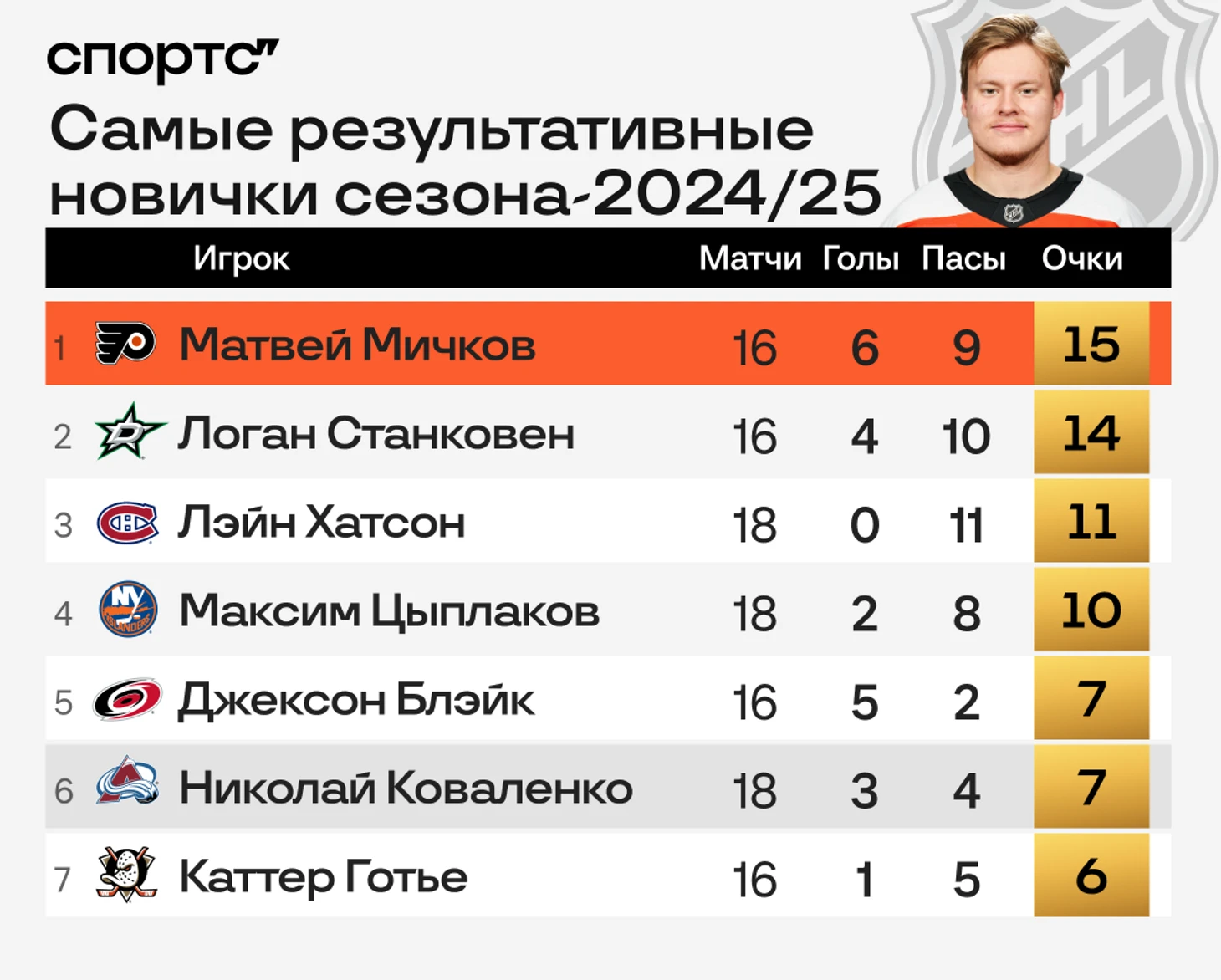 Благодаря рывку за эту неделю Мичков вернул себе лидерство в таблице лучших бомбардиров среди новичков – обошел Логана Станковена из «Далласа»: