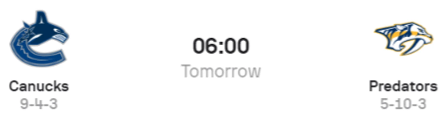 «Нэшвилл» ожидает тяжелый выездной матч против «Ванкувер Кэнакс». Хозяева отлично начали сезон и идут на 6-ом месте Западной Конференции, а в случае победы канадская команда увеличит отрыв от 9-ой строчки до 5 очков. Их противники ведут борьбу за то, чтобы покинуть последнюю строчку, и пока далеки от зоны плей-офф.