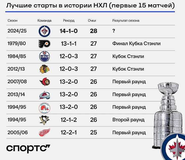 Упрямая история гласит, что старты, подобные старту «Джетс», почти никогда до добра не доводят. Прежде лишь шести командам за последние 30 лет удавалось начать с 12+ побед и 26+ очков в первых 15 матчах. Четыре из них («Колорадо»-2013/14, «Оттава»-2007/08, «Детройт»-2005/06 и «Квебек»-1994/95) вылетели в первом раунде. Пятая («Питтсбург»-1994/95) – во втором, правда, проиграли «пингвины» будущим чемпионам, «Нью-Джерси». А вот «Чикаго» в сезоне-2012/13, начав с 12 побед и 3 поражений за рамками основного времени, в итоге взял Кубок Стэнли.