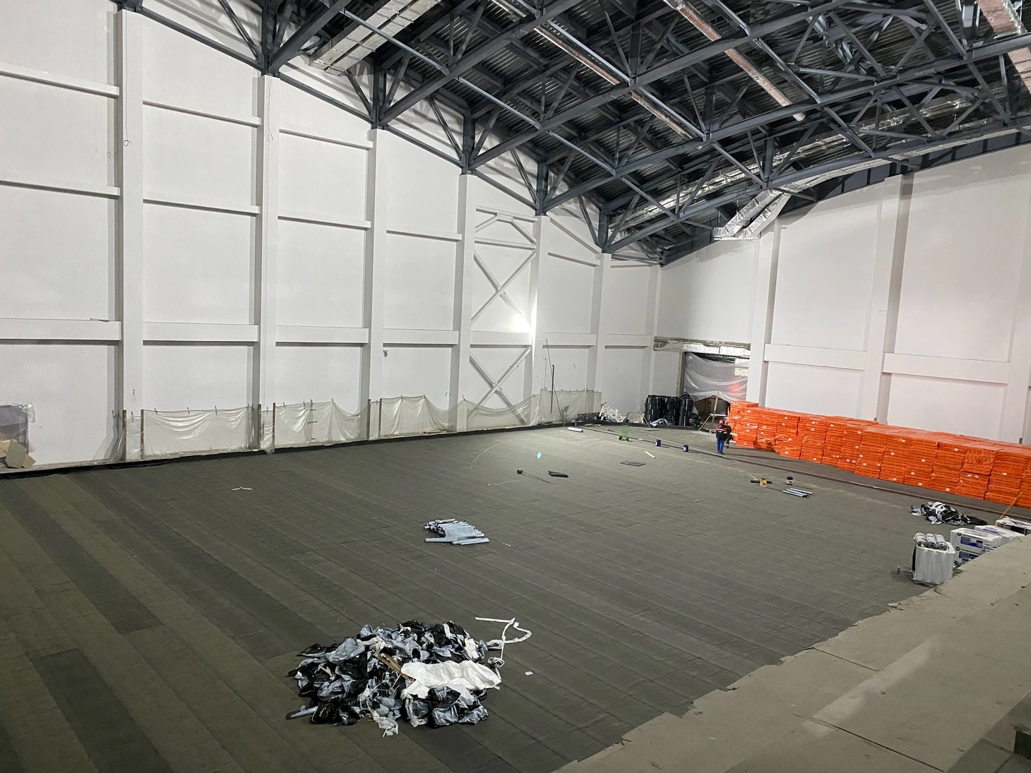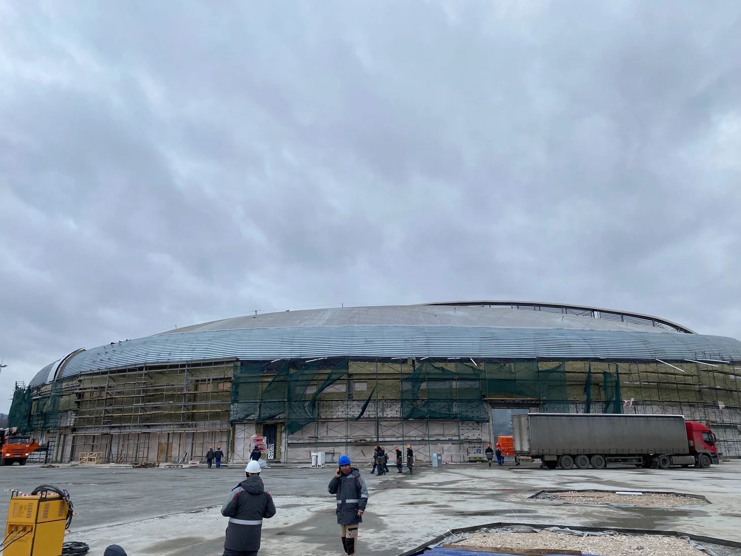 – На данный момент подрядчик ведет работы по благоустройству прилегающей территории, по возведению стен и перегородок из гипсокартона, по прокладке внутриплощадочных и внутренних инженерных сетей, по монтажу технологии ледовых полей (подразумевает «пирог» из слоев теплого и холодного пола, плит перекрытий и мембраны), по отделке помещений и утеплению фасада. Слой утеплителя смонтирован на 40%, – рассказал заместитель генерального директора по капитальному строительству Вадим Жоган