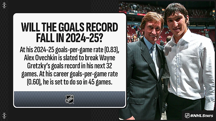 Несмотря на то что сейчас Овечкин находится вне игры из-за травмы, он сохраняет 868 голов в своей карьере — всего в 27 шайбах от рекорда Гретцки. Овечкин идет с опережением графика Гретцки на пути к 894 голам.