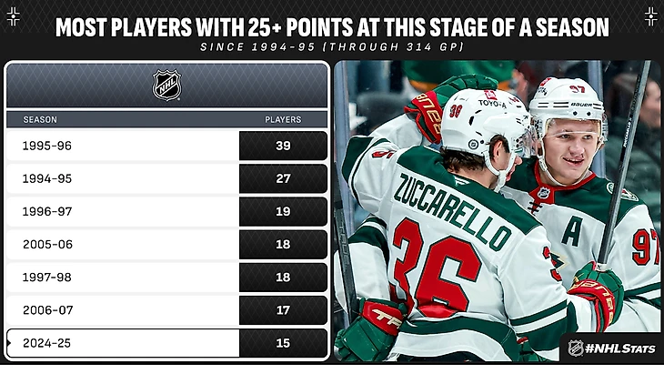 Семь из 24 игроков, забивших двузначное количество голов в сезоне 2024-25, находятся в пределах трех шайб от лидеров Лиги — Александра Овечкина (15), Леона Драйзайтля (15) и Сэма Райнхарта (15). Овечкин — единственный из этой группы игроков, кто ранее выигрывал трофей Maurice «Rocket» Richard.