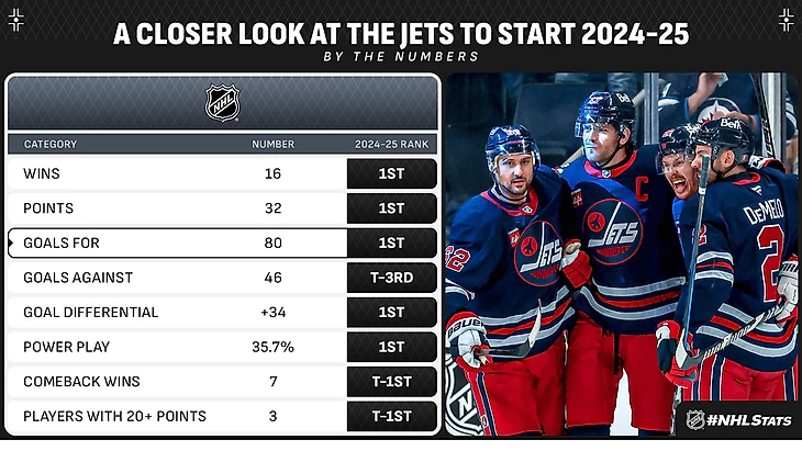 «Виннипег Джетс» начали сезон 2024-25 с повторения рекорда франшизы по самой длинной победной серии (8-0-0) и установления нового рекорда по победам на выезде (7-0-0). Этот успешный старт позволил им показать лучший результат в истории Лиги за первые 15 игр сезона (14-1-0) и стать самой быстрой командой, достигшей отметки в 15 побед (за 16 матчей).