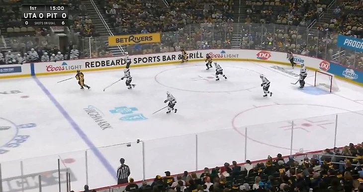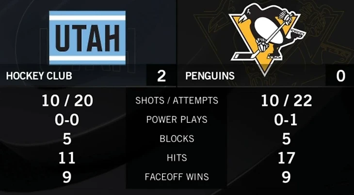 Матч начинается достаточно динамично, и уже на первой минуте Маверик Ламуре №10 (13 игр, 1+2) отправляется на скамейку штрафников за удар клюшкой соперника. Первое большинство позволяет Питтсбург создать несколько хороших бросков, но спец. бригада Юты и Веймелка не позволили забросить шайбу в ворота.