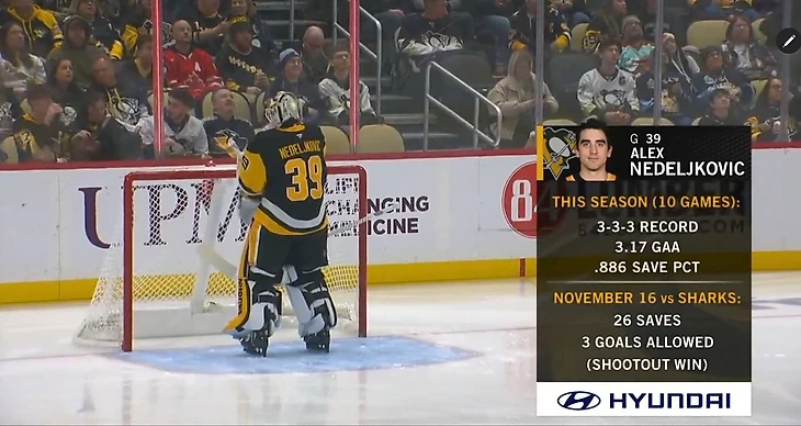 Алекс Неделькович №39 (10 игр, 3 победы, 88.6% отраженных бросков) в матче с Сан-Хосе смог отразить 89.7% бросков по воротам и тем самым помог Пингвинз одержать победу в ОТ (Питтсбург - Сан-Хосе 4:3ОТ).