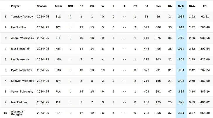 Ярослав Аскаров возглавил таблицу по проценту отраженных бросков, в своем единственном матче он отразил 29 бросков из 31. 1 матч не совсем корректный показатель, посмотрим какая статистика будет у Ярослава на дистанции, если ему еще будут давать шансы.
