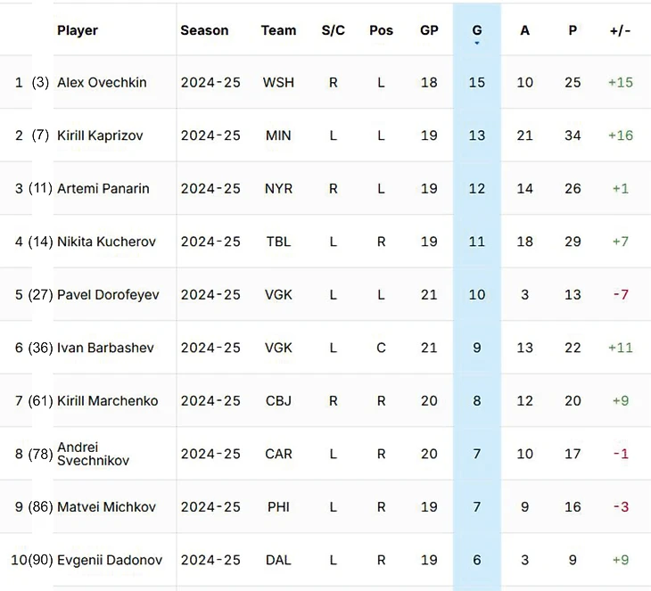 Тройка лучших снайперов среди наших игроков выглядит следующим образом: Александр Овечкин (15 голов), Кирилл Капризов (13 голов) и Артемий Панарин (12 голов).
