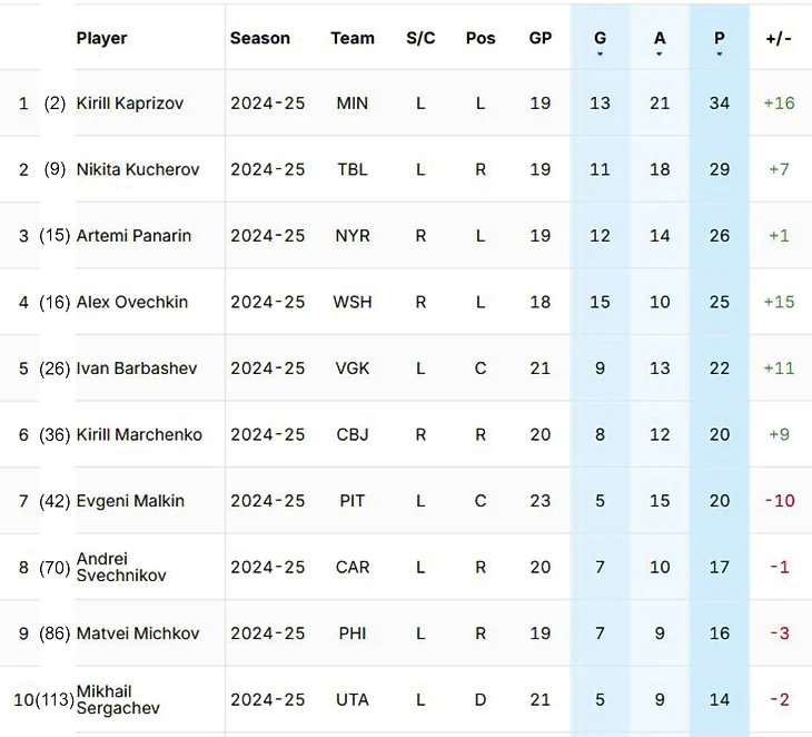 Топ-3 наших бомбардиров не меняется уже 4 неделю: Кирилл Капризов (34 (13+21) очка в 19 матчах), Никита Кучеров (29 (11+18) очков в 19 матчах) и Артемий Панарин (26 (12+14) очков за 19 матчей). Отмечу появление Михаила Сергачева в десятке лучших бомбардиров, у Сергачева 14 (5+9) очков в 21 матче.