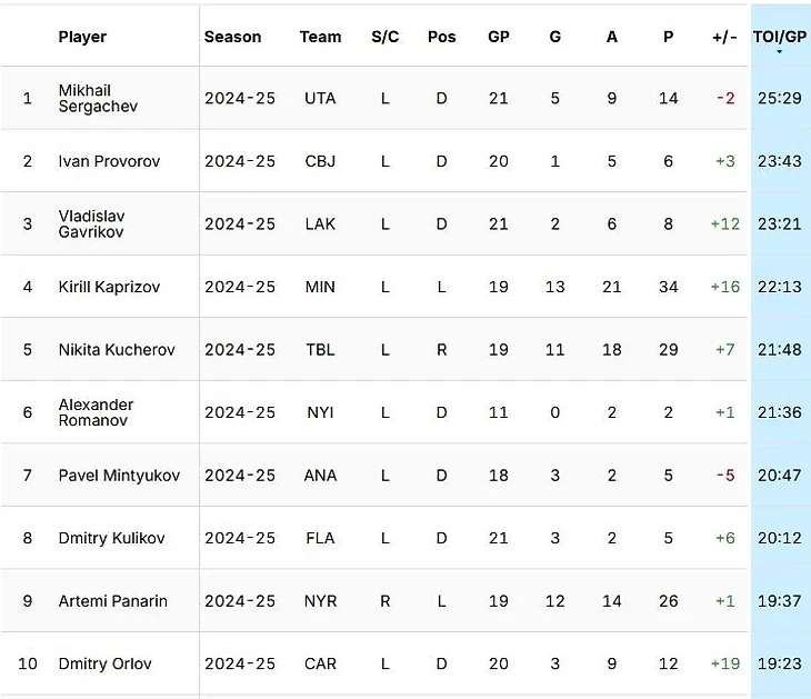 Лидером по игровому времени среди наших игроков остается Михаил Сергачев, который занимает первую строчку с первого матча. В общем списке НХЛ он идет 4 уступая лишь Заку Веренски («Коламбус», 26:05), Сету Джонсу («Чикаго», 25:43) и Трэвису Санхейму («Филадельфия», 25:32). В топ-10 по игровому времени располагается 3 форварда – Кирилл Капризов, Никита Кучеров и Артемий Панарин.
