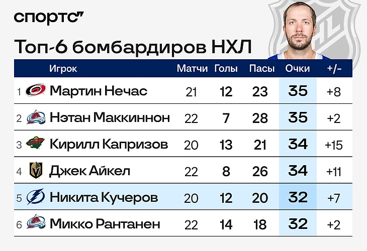 Кучеров вторым из россиян (вслед за Кириллом Капризовым) преодолел отметку в 30 очков в сезоне-2024/25. В списке бомбардиров он делит пятое место с Микко Рантаненом – у обоих по 32 балла.