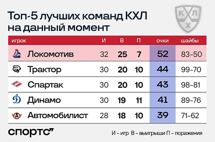 «Локомотив» мощно стартовал в регулярке-2024/25: за 32 игры набралось 25 побед и 52 очка. Следом идет лидер Востока «Трактор», который отстает сразу на 8 очков. Даже разница в две игры не влияет на положение «Локомотива» – у команды Игоря Никитина все равно есть прочный запас.
