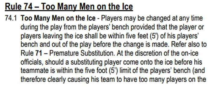 4, а то и 5 игроков «Флэймз» находились на льду в один момент. Но, согласно правилам НХЛ, и меняющий, и меняющийся игроки могут находиться на льду одновременно, но не дальше 5 футов от скамейки (152 см).