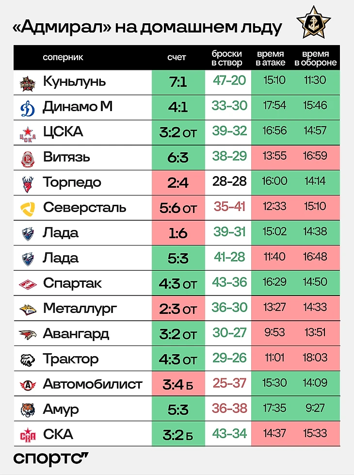 Особенно грозным «Адмирал» выглядит на своем льду – команда играет исключительно в атаку и лишь в трех матчах уступила по количеству бросков в створ. Против московских команд эта статистика выглядит еще более невероятной.