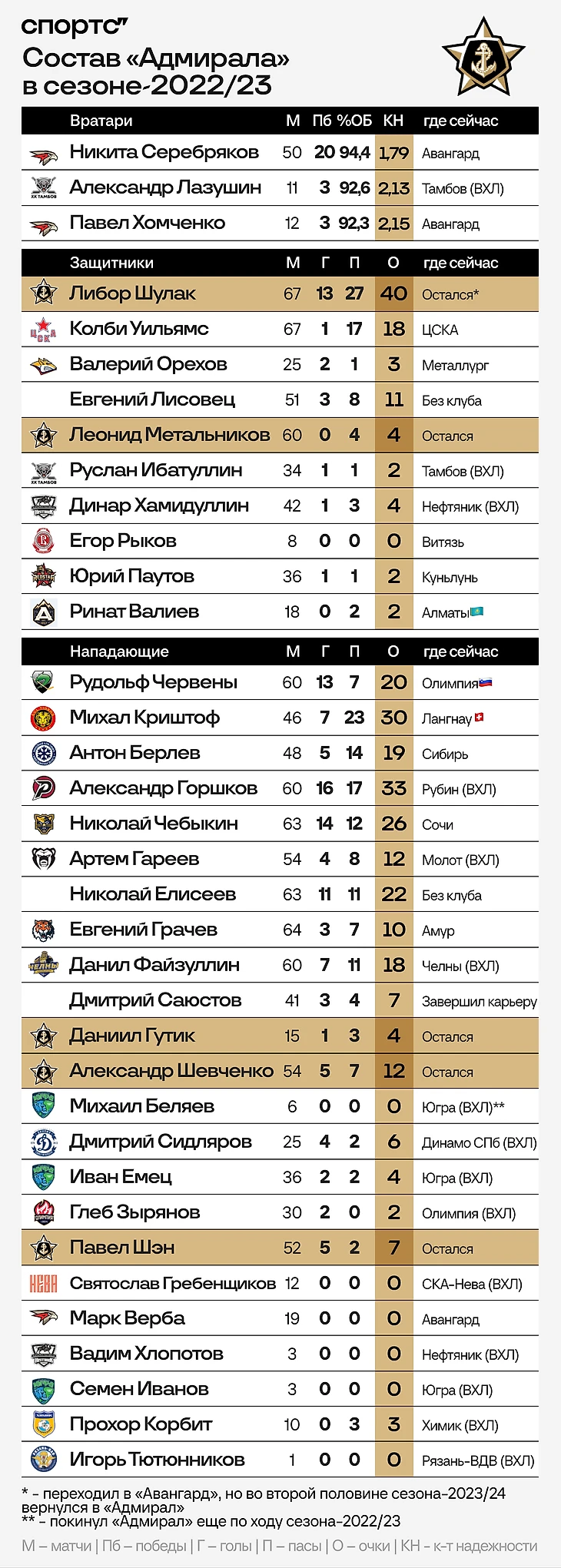● Почти у половины хоккеистов, сыгравших хотя бы один матч за «Адмирал» в том сезоне, карьера пошла на спад. 15 из 36 хоккеистов сейчас играют в ВХЛ, а двое вообще не могут найти новую команду.